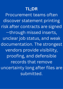 Missed inserts. Partial runs. Conflicting answers when a regulator or internal audit asks what happened. These are the moments where statement printing risk becomes visible—and where procurement teams are expected to have answers.